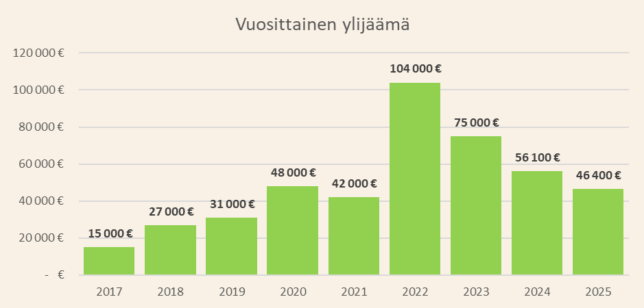 Ylijäämä kuvaa säästöön jäänyttä pääomaa. Tätä käytän lähinnä sijoituksiin. Ylijäämän lasken yksinkertaisesti vähentämällä kulut tuloista.