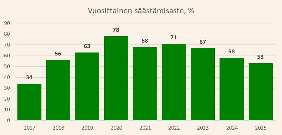 Säästämisaste kuvaa ylijäämän prosentuaalista osuutta tuloista.