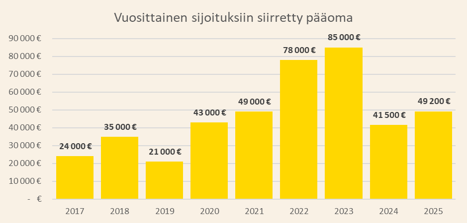 - Vuosi 2025: Lohkaisin kohtuullisen osan sijoitusvarallisuudestani työnantajayritykseni osakkeisiin, joka on listaamaton pk-yritys.