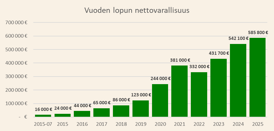 - Vuosi 2024: Nettovarallisuuteni ylitti ensimmäisen kerran puoli miljoonaa euroa ja perheeseemme syntyi esikoinen.