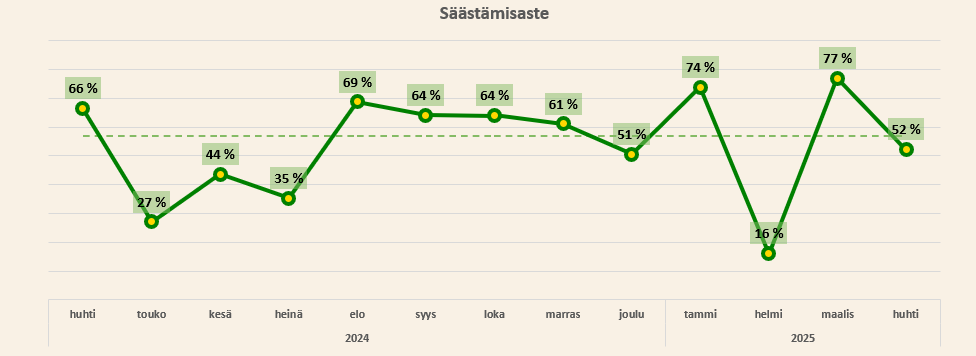 Oli mukava todeta, että säästämisaste pysyi yli 50%, vaikka tein merkittävän investoinnin uuteen ruohonleikkuriin. Enää olisi yksi iso budjetoitu investointi jäljellä, joka on uudet kesärenkaat autooni. Nykyisissä on sen verran vähän kulutuspintaa jäljellä, että ne pitää vaihtaa kesän aikana, mutta ihan sakkorenkaat ne eivät vielä ole. Tästä syystä pohdiskelin, että voisin ajaa niillä nyt vielä kesän ja tehdä investoinnin loppukesästä tai alkusyksystä, jolloin toivottavasti alennuskamppiksia olisi käynnissä.
