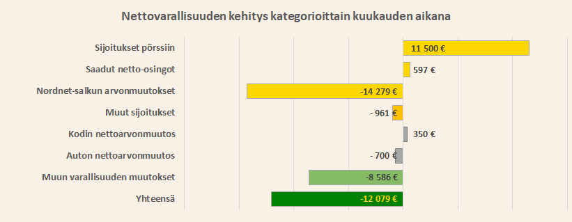 Nettovarallisuuteni laski 12 000 euroa kuun aikana lähinnä sijoitusten takia.