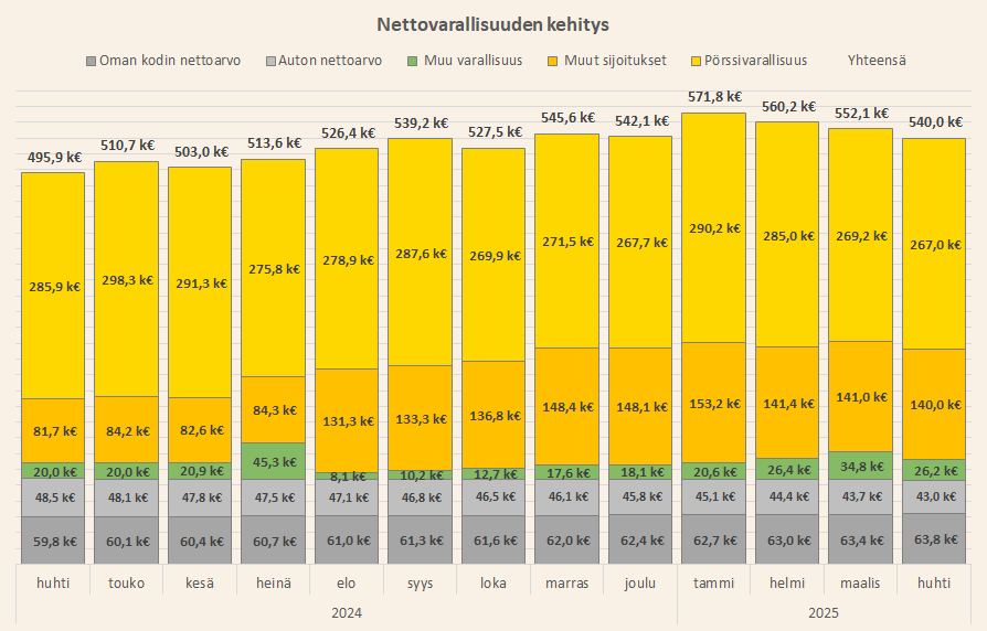 Nettovarallisuuteni laski tasolle 540 000 euroa huhtikuun lopussa.