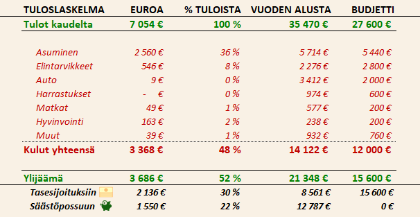 Tulot olivat työmatkojen seurauksena normaalia korkeammat, kun sain verottomia korvauksia kilometreistä ja päivärahoista. Lisäksi kulut olivat yllättävän maltillisella tasolla ottaen huomioon, että tein yhden merkittävän budjetoidun investoinnin.