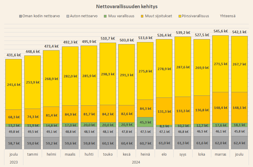 Tämän vuoden budjetoitu 510 000 euron nettovarallisuustavoite meni heittämällä yli, mikä on hieno asia tulevien vuosien tavoitteiden kannalta. Voin vähän höllentää siiman kireyttä ja silti päästä miljoonaan euroon ennen vuoden 2028 loppua. Tälle vuodelle olin budjetoinut ylijäämää 46 800 euroa ja sijoitustuottoja 31 774 euroa, joista yhteensä tuli kasvutavoite 78 573 euroa. Lopputulema oli 56 060 euroa ylijäämää eli melkein kymppitonni budjetoitua enemmän ja 54 497 euroa sijoitustuottoja eli noin 23 000 euroa parempi. Kokonaisuutena vuosi oli siis menestys sekä tulojen että sijoitusten suhteen. Tästä asetelmasta on hyvä lähteä rakentamaan vuoden 2025 skenaariolaskelmia ja budjettia. Palataan niihin tarkemmin vielä tammikuun aikana!