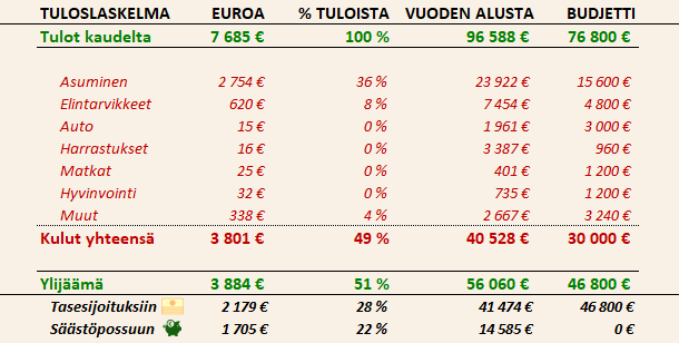 Alkavan vuoden budjettia varten pitää laskea asumiskulut huolellisemmin auki ja ottaa ruokakuluihin realistisempi ote. Muilta osin kokonaisuus oli varsin hyvin hallussa, vaikka rivikohtaista heittoa olikin.