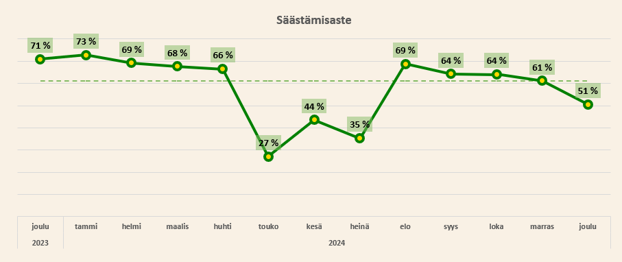 Korkeista joulukuun kuluista huolimatta sain pidettyä säästämisasteen niukasti yli puolessa eli yli 50% tason. Budjettiin en kuitenkaan lopulta yltänyt, mutta se ei oikeastaan haittaa, koska olin hyvin lähellä (toteuma 58% koko vuosi verrattuna 61% budjetti) ja ylijäämä meni heittämällä yli budjetoidun. Kokonaisuus oli siis hyvä ja siihen voi olla tyytyväinen eli ei muuta kuin samalla kaavalla seuraavaan vuoteen.