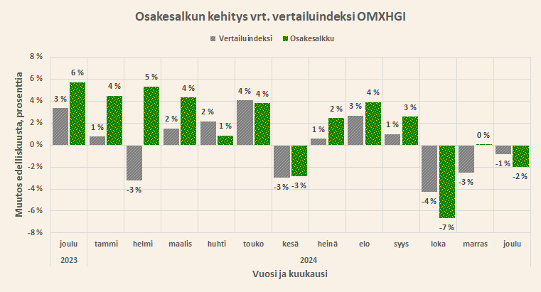 Joulukuu oli sijoituksilleni kauttaaltaan heikko kuukausi. Jopa niin heikko, että ne jäivät jälkeen paljon parjatusta hesulista. Ylimääräistä tappiota indeksiin nähden syntyi 3000 euroa, joten oman salkun koollani ei kuitenkaan massiivisista eroista puhuta. Joulukuun synkistelyistä huolimatta koko vuotta tarkasteltaessa ylituottoa kertyi 44 340 euroa, joka alkaa jo näyttää varsin positiiviselta lukemalta.