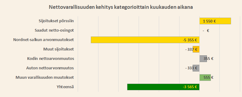 Nettovarallisuus tosiaan jäi pakkaselle johtuen nonnerosalkun heikosta kehityksestä. Myös muut sijoitukset jäivät tappiolle, mutta siellä liikkeet olivat hyvin pieniä. Oikeastaan mitään hirveän positiivista on vaikea nostaa joulukuun luvuista; puolustuspeliä pelattiin ja yritettiin minimoida tappion määrä.