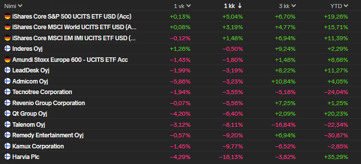 Yksittäisten omistuksieni kuukauden kehitys oli varsin karua luettavaa. Ainoastaan Euroopan ulkopuolelle sijoittavat ETF-rahastot nousivat ja kaikki muu laski. Erityisesti Harvian massiivinen lasku vahingoitti salkkuni kokonaisarvoa, koska se on 20% painolla mukana. ETF:t ovat kasvaneet jo 35% painoon koko salkusta, joten niiden pikkuplussasta tuli jo ihan oikeaa vetoapua parempiin kokonaistuottoihin. Harvia ei varsinaisesti julkaissut mitään uutisia kuun aikana ja suurin lasku keskittyi kuun viimeisiin päiviin, joten oletan, että suuren liikkeen takana oli yksittäiset rahasto-omistajat, jotka halusivat myllätä positioitaan ennen kvartaaliraportointia.