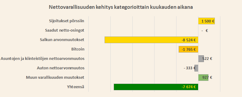 Sijoitukset laskivat yhteensä yli kymppitonnin. Positiivinen kassavirta paikkasi tätä jonkin verran, mutta tuo oli liian iso aukko paikattavaksi kerralla. Tuloksena nettovarallisuuteni laski 7674 euroa.