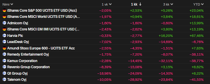Näistä valtavista miinuksista se 7% lasku yhteensä koostuu. Suurin negatiivinen ajuri oli Qt Group, koska se on suurella painolla salkussani. Markkina ei selvästi innostunut raportoidusta 10% liikevaihdon kasvusta. En itsekään tästä innostunut ja siksi en kasvata positiota, mutta kärsivällisyyteni riittää katsomaan myös Q4-luvut ennen kuin teen mitään sen suurempia peliliikkeitä. Myös Revenion lasku vaikutti vahvasti salkkuni kokonaiskehitykseen. Heilläkin raportoidut luvut jäivät odotuksista, mutta matkassa oli epäonnea valuuttakurssien suhteen. Ei siis vielä aiheuta toimenpiteitä.