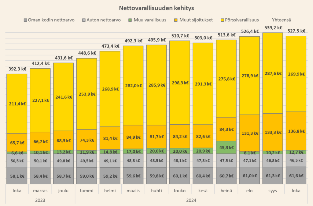 Tilinpäätös 64/114. Seuraan kuukausittain oman talouteni kehitystä kohti tavoitettani, joka on miljoonan euron nettovarallisuus vuoden 2028 loppuun mennessä.