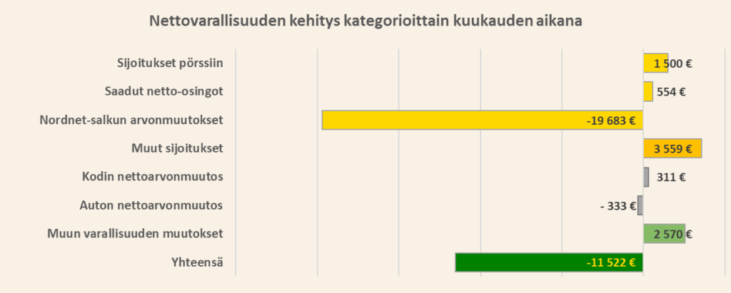 Raaka fakta on, että 7% laskua sijoitussalkussa ei paikata mitenkään muiden omaisuuserien tuotoilla. Nettovarallisuuden laskua niillä kuitenkin voi jarruttaa. Siinä missä sijoitussalkusta tuli vajaa parikymppiä lunta tupaan, niin muualta tuli noin kasin verran plussaa. Kokonaisuus jäi siis vahvasti miinukselle.
