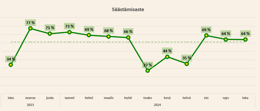 Viime kuukaudet säästämisaste on pysynyt hyvin tasaisena, mitä jokseenkin myös ennakoin. Marraskuussa on riski sille, että säästämisaste vielä kyykkää, kun maksettavaksi tulee vuokra-asuntoon kohdistuvia remppakuluja, mutta toisaalta saan yli 4000 euroa veronpalautuksia, joka tasapainottaa tilannetta. Joulukuun pitäisi olla suhteellisen vakaa. Jää nähtäväksi saanko kirittyä 3%-yksikön eron budjettiin kiinni säästämisasteessa viimeisen kahden kuukauden aikana.