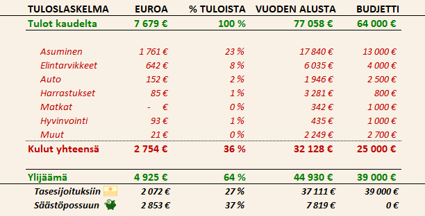 Lopulta ylijäämää jäi vajaat 5000 euroa, joka on varsin mukava määrä rahulia yhdeltä kuulta säästöön.