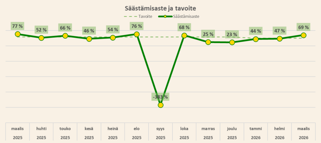 Maaliskuun 69% säästämisaste nosti koko vuoden kumulatiivisen säästämisasteen lukemaan 56%. Tässä on hieman turvamarginaalia 50% budjetoituun tasoon, mutta kokemus on osoittanut, että ilman tiukkaa kulukontrollia säästämisaste valahtaa kovin helposti heikkoihin lukemiin.