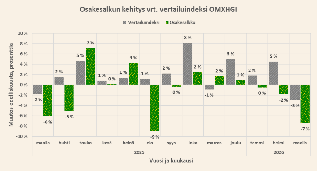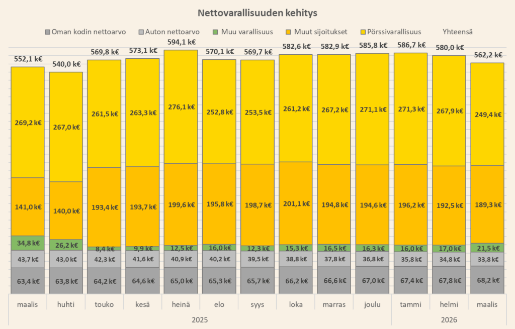 On uskomatonta, kuinka vakaasti osakkeet voivat laskea kuukaudesta toiseen ilman, että pohja on kosketeltavissa. Maaliskuussa laskulta ei välttynyt mikään omistukseni ja erityisen laskun otti Emerging Markets -ETF, joka vielä hetki sitten oli salkkuni parhaiten tuottanut omistus. Jopa yritysvelkakirja-ETF otti isoa osumaa, kun korot pomppasivat räjähtäen. Laskusta huolimatta indeksit tuntuvat vielä kalliilta, joten en ole lähtenyt ostelemaan mitään. Oman näkemykseni mukaan laskuvaraa on vielä reippaasti ja Iranin sodan kärjistyessä romahdus voi olla yllättävänkin iso. Virittelen ostohousuja tällaista romahdusta varten. Muilta osin kuukausisäästöt rullaavat normaalisti.