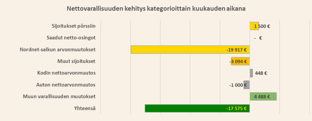 Kun suurin osa nettovarallisuudesta on sidottu pörssiin, on lasku taattua, kun pörssit sukeltavat. Niin kävi nytkin. Hyvästä palkkatulojen ylijäämästä huolimatta nettovarallisuuteni laski 17 575 euroa kuun aikana.