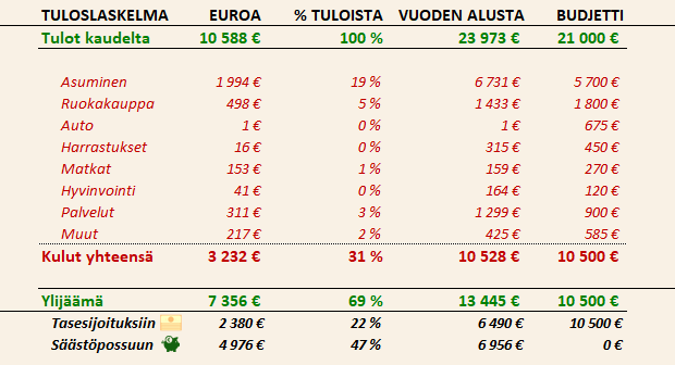 Odotuksien mukaisesti vuosibonukset kilahtivat tilille ja kasvattivat kuukauden ylijäämää. Samalla yritin pitää kulut maltillisina, jotta budjetti ei paukkuisi. Tämä jokseenkin onnistui ja nyt tuloslaskelma näyttää kohtuullisen hyvältä kolmen kuukauden jälkeen.