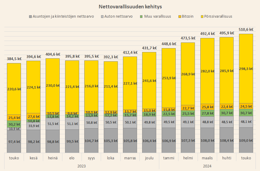 Nettovarallisuuteni oli 510 600 euroa toukokuun lopussa, joka on ensimmäinen yli puolen miljoonan euron kuukausi ja samalla myös korkeampi kuin tämän vuoden tavoitteeni 510 000 euroa.