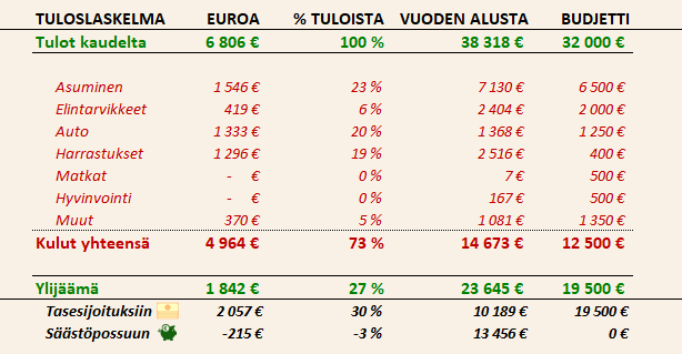 Siinä se nyt oli. Tämän vuoden tavoite 510 000 euroa tuli täyteen. Ylijäämän osalta on odotettavissa vielä 23 000 euroa lisää loppuvuonna. Sijoitukset ovat siis pärjänneet 23 000 euroa odotuksia paremmin. Yleensä se mikä menee nopeasti ylös, tulee myös nopeasti alas. On siis täysin mahdollista, että tipun vielä takaisin alle tavoitetasoni, mutta pitää nyt kuitenkin iloita näistä pienistä saavutuksista aina kuin on mahdollista.