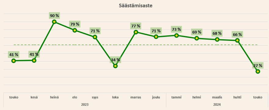Säästämisaste sukelsi toukokuussa johtuen korkeasta kulutasosta, mutta koko vuosi on vielä 61% budjetoidulla tasolla.