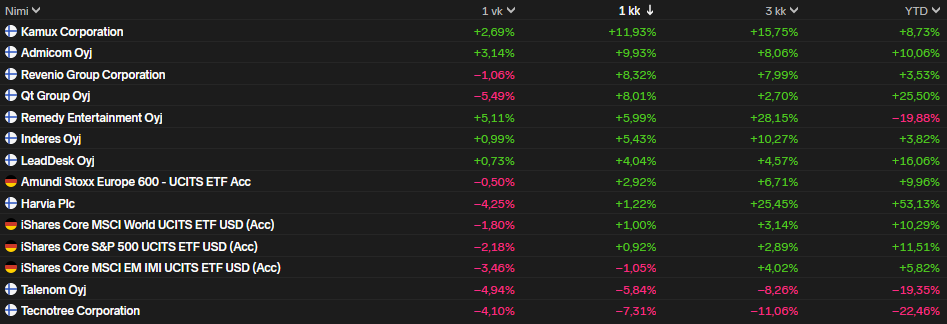 Salkkuni kovin nousija oli Kamux, mutta vahvoja olivat myös Admicom, Revenio ja Qt. Kamuxin ensimmäinen kvartaali oli kohtuullisen hyvä ja selkeisiin epäkohtiin Ruotsin toiminnoissa oli puututtu kovin ottein. Ruotsin ongelmista huolimatta yhtiö jatkoi kannattavaa liiketoimintaa. Olettaen, että yhtiö saa Ruotsin kuntoon, tulosparannuspotentiaalia on ja tämä näkyi kurssissa. On mielenkiintoista seurata mitä Pajuharju toimitusjohtajana saa aikaan, kun pohjalla on erinomainen suoritus Harvian puikoissa.