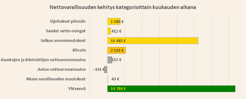 Nettovarallisuuteni kasvoi noin 14 800 euroa toukokuun aikana lähinnä sijoitusten ansiosta.