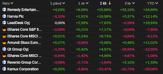 Salkussani on nyt siis kaksi riviä vähemmän kuin aiempina kuukausina ja olen entisestään hajauttanut pääomia pörssin ulkopuolelle siinä toivossa, että saan sieltä parempaa pääoman tuottoa kuin kilpailluilta osakemarkkinoilta. Kuukauden nousijoita olivat Remedy ja Harvia suurella marginaalilla. Salkkuni on nyt 51% ETF-rahastoja eli osakekohtainen heilunta jää kuukaudesta toiseen pienemmäksi ja menon pitäisi tasaantua merkittävästi. Toisaalta salkkuseuranta muuttuu jatkuvasti tylsemmäksi, koska rahastoissa puheenaiheena on lähinnä makrotalous eikä firmakohtaiset draamankaaret.