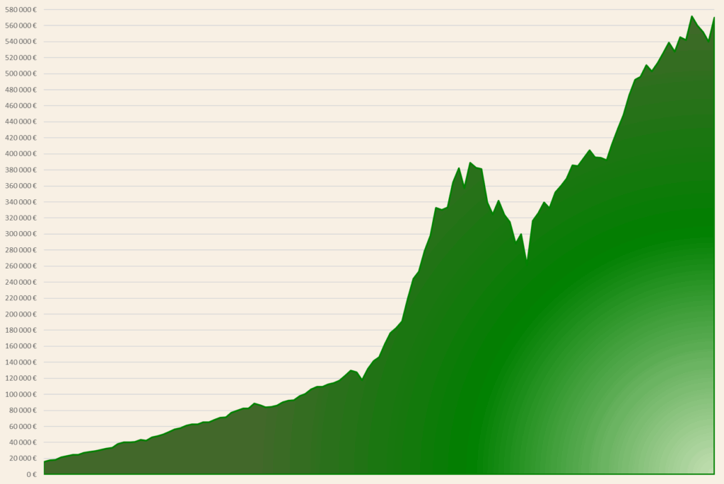 Nettovarallisuuteni kehitys 10 vuoden varallisuusseurannan aikana. Liikkeelle lähdettiin alle 20 000 eurosta ja kasvu oli lineaarista koronaan asti. Siitä pienen romahduksen kautta sinkouduttiin pökerryttävälle kasvupolulle. Vuoden 2022 laskun jälkeen nousu on ollut taas nopeaa.