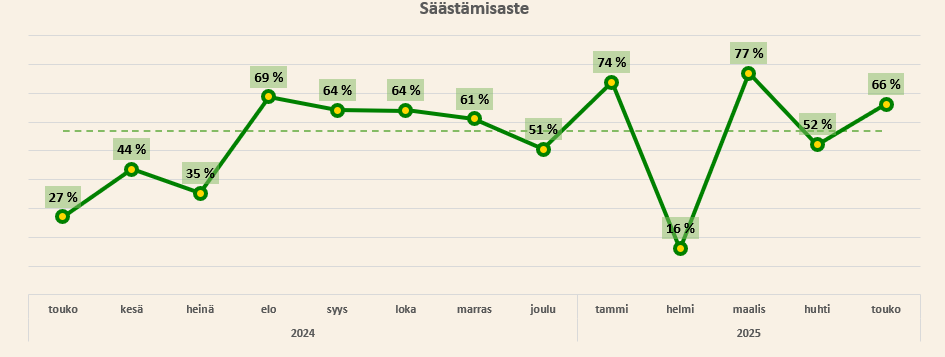 Ylimääräisten kulujen puuttuessa säästämisaste oli varsin hyvällä tasolla. Tämän vuoden isoista investoinneista on jäljellä enää uudet kesärenkaat autooni. Tämä tulee maksamaan arviolta tonnin, joten isossa kuvassa ei sekään merkittävä paukku ole. Eniten tässä jännittää, että saanko pidettyä ostohalut kurissa ja vältettyä turhia ostoksia koko loppuvuoden, sillä onhan tässä vielä vuotta jäljellä.