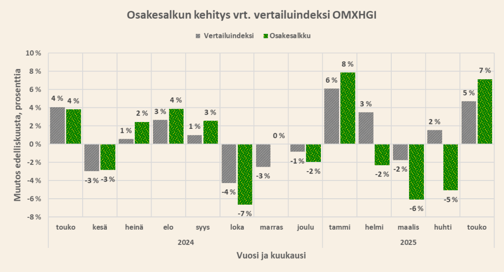 Toukokuussa sijoitussalkkuni nousi 7%, kun Helsingin pörssin OMXHGI nousi 5%.