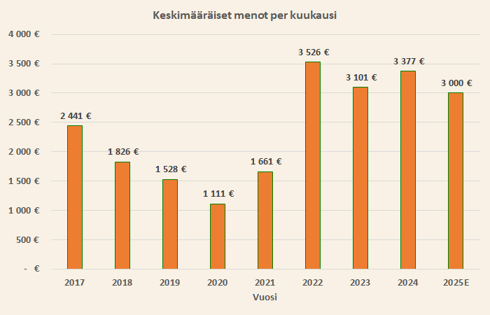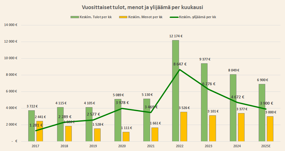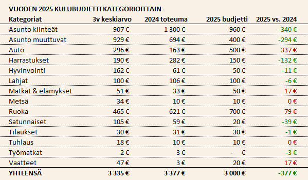 Käyn tässä tekstissä läpi ensin budjettini vuodelle 2025 ja sen jälkeen tavoiteasetannan skenaariolaskelmien kautta ottaen huomioon päätavoitteeni, joka on miljoonan euron nettovarallisuus vuoden 2028 loppuun mennessä. Ohjaavana ajatuksena on, että tämän vuoden tavoitteen ja päätavoitteeni pitää olla keskenään linjassa.