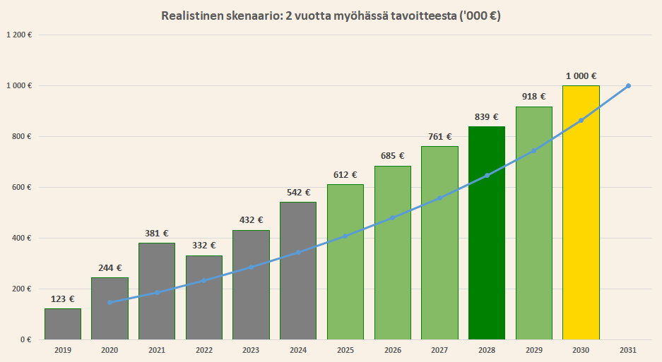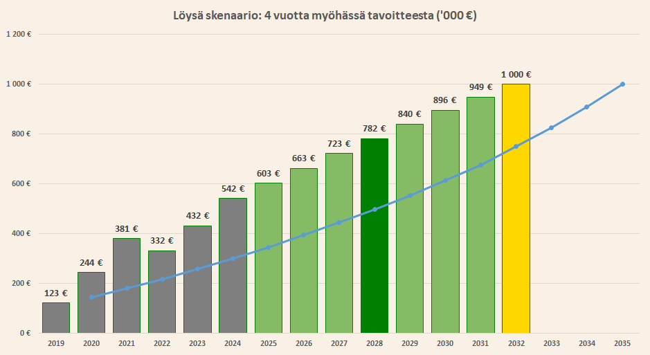 Tavoiteskenaario on haastava ja parametrit ovat armottomat, mutta en pidä niitä mahdottomina. Paljon asioita pitää mennä oikein ja onneakin pitää olla matkassa. Aktiivisella tekemisellä voi kuitenkin vaikuttaa lopputulokseen ja elämässä on tapana käydä niin, että ne asiat käyvät toteen, joihin huomio on kiinnittynyt.