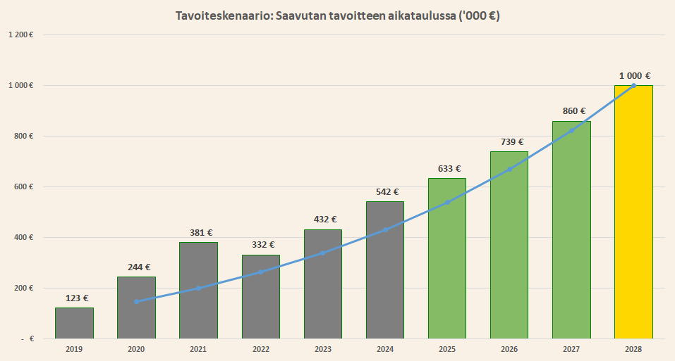 Bonuksena seuraan vielä laskennallista skenaariota, joka perustuu puhtaasti matematiikkaan eli keskimääräiseen nettovarallisuuteni vuosikasvuun (CAGR) mittaushistoriani alusta vuodesta 2016. Tuo vuosikasvu oli nyt vuoden 2024 päätyttyä 37%. Mikäli tämä sama vuosikasvu jatkuisi tästä eteenpäin, saavuttaisin miljoonan euron tavoitteeni kaksi vuotta etuajassa vuonna 2026 ja vuonna 2028 olisi kasassa melkein tuplat alkuperäiseen tavoitteeseen nähden. Uskoo sen tahtoo! Tämä laskenta ei ota huomioon realiteetteja kuten pienten lukujen matematiikka (pienillä absoluuttisilla luvuilla kasvuprosentit ovat näyttäviä), marginaaliveroprosentin kiristyminen (60% lisäansioista), kuluoptimoinnin rajallisuus (valinnaiset kulut on helpompi poistaa kuin pakolliset kulut) tai sijoitusmarkkinoiden oikut (voidaan myös laskea kuten vuonna 2022 kävi).