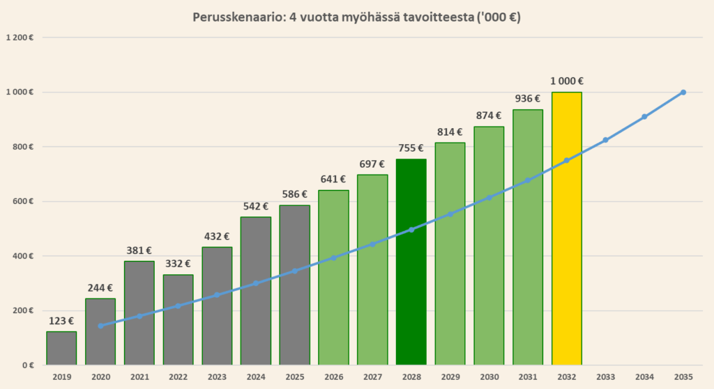 Perusskenaariossa pyrin mallintamaan tilanteen niin, että tähän ainakin pystyn, vaikka asiat eivät menisi aivan putkeen. 3,1% sijoitusten tuottoon minun ainakin pitäisi pystyä ja tämä ei ole edes inflaatiokorjattu tuotto, vaan nominaalinen luku. Tällä tuotto-odotuksella miljoona kyllä tulee saavutettua, mutta 4 vuotta myöhässä tavoiteaikataulua, mikä ei kuulosta aivan katastrofilta. Lukuja katsoessa voi kuitenkin todeta, että korkoa korolle -ilmiö ei ehdi vielä vaikuttamaan merkittävästi ja suurin osa kasvusta tapahtuu raa’asti ylijäämää sijoituksiin runnomalla.