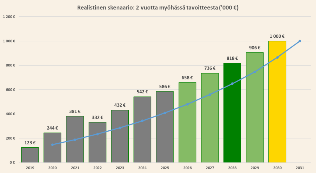 Realistinen skenaario kuvastaa sitä näkemystä, mihin uskon pystyväni kohtuullisella vaivalla. Jotta pysyisin tämän skenaarion tahdissa, likvidien sijoitusteni (pörssi, rahastot, bitcoin) tulisi tuottaa melkein kymmentä prosenttia vuodessa. Lisäksi tässä skenaariossa alkaa olla jo vaatimusta saada kohtuullista tuottoa työnantajayritykseni osakkeille eli käytännössä firman arvon pitää nousta vuoden aikana. Hankin osakkeeni pienellä alennuksella, mikä tarkoittaa, että oikeastaan jos ne arvotettaisiin käypään arvoon, niin tuottovaatimus tulisi jo täyteen. Haaste onkin saada riittävän luotettavasti selville mikä tuo käypä arvo oikein on, laput kun eivät ole päivittäisen kaupankäynnin kohteena. Tämän tiedon selvittäminen voisikin olla yksi tavoitteeni tälle vuodelle.