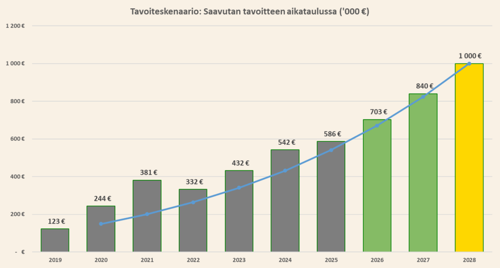 Tavoiteskenaarioni mukaisesti, jotta miljoona olisi vielä aikataulullisesti sateenkaaren päässä, tämän vuoden nettovarallisuustavoitteeksi muodostuu 703 000 euroa. Tämä tarkoittaa 117 000 euron kasvua vuoden alun tilanteeseen verrattuna. Budjettini mukaisesti 42 000 euroa tästä kasvusta tulee ylijäämästä. Se jättää sijoituksille 75 000 euron tuotto-odotuksen.